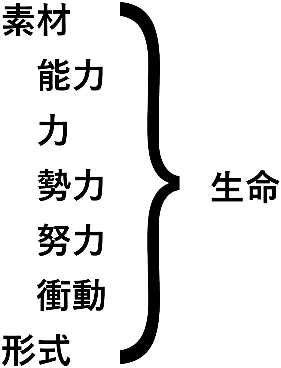 この種の表現はなお若干の希望をさしはさむべき点をともなっている、なぜならば一つの有機的物質においては、それがどれほど生き生きと思惟されているとしても、なお常になにほどか素材的なものが付着しているからである。力という語はまず単に物理的なるものを、さらには機械的なるものを言いあらわすのであり、そしてかの物質から組織されるべきところのものは我々にとって不明な、理解すべからざる点として残るのである。そこでブルーメンバッハはかの表現の最高および最終のものを獲得した、彼は謎の語を擬人化して、それについて語られていたところのものを創造本能、すなわちそれによって形成が行われるべき熾烈なる作用としての衝動と呼んだ。