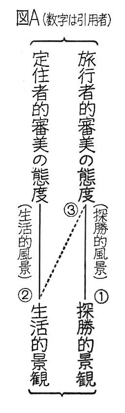 最近上梓された『〈イメージ〉の近代日本文学誌』の中で、木股知史は、この同じ「忘れえぬ人々」に柄谷とは違った仕方で考察を加えている(「風景の詩学」)。その考察の中で、この点に関し示唆を与えるのは、木股が別の文脈で取りあげているある図式をめぐっての彼の見解である。彼は勝原文夫のやはり「風景」を扱った労作『農の美学——日本風景論序説』から一つの景観意識の構造に関する図式を引いている。勝原は、まず「風景」を「景観」(視野に映る環境)に「審美的態度」の重ねられたものと考え、その考えに従って、後者を「旅行者の態度に立つ場合」と「定住者の態度に立つ場合」とに、また前者を「名勝等の非凡な探勝的景観」と「平凡な生活的景観」とに二分したうえ、このような図(A)を提示している。