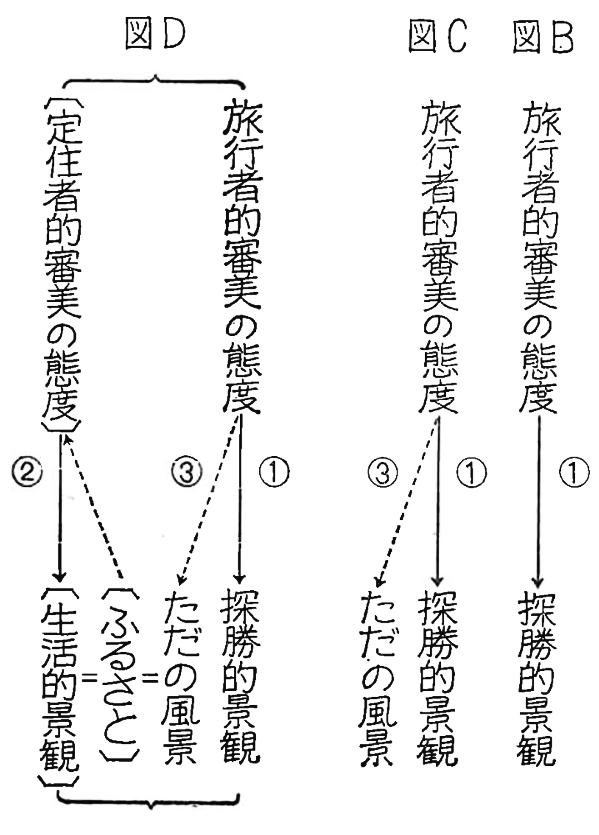 おそらく「定住者的審美の態度」というようなものはない。それは、こうした"〝転倒〟の産物として、虚構のまま人の脳裡に住まうのである(図D))。以上のプロセスは、図Bから図Dへの推移として図示しうるだろう(一六八頁参照)。