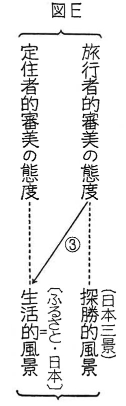 『日本風景論』から四分の三世紀をへて、日本にもう一つの大規模な景観意識の改変が起こる。この時、五年前からはじまっている「ディスカバー・ジャパン」キャンペーンは、国木田の発見した「ただの風景」の転倒の転倒として、つまり「生活的風景」と見なされてきた「ただの風景」の「探勝」化として、奇異な事態を日本に進行させているのである(先の図Aにおける実線と破線の転倒。図E)。