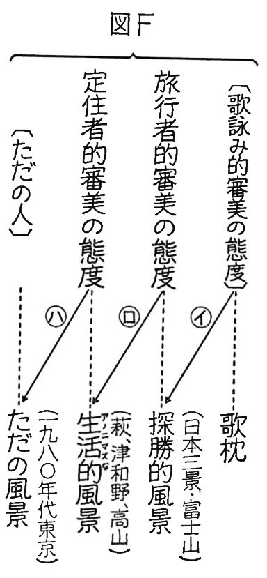 以上、ここに述べてきた『日本風景論』、「ディスカバー・ジャパン」、「東京の発見」(東京論の流行)という三つの 出来事  に現れている景観意識の変容を、平安期の歌枕的風景秩序からの移行として示せば、次のような図が得られるだろう(図F・二〇〇頁)。『日本風景論』の発見している「日本」は「日本三景」から「富士山」への中心の移動を含むとはいえ、やはり江戸期以来の審美眼による「探勝的風景」としての日本である(イ)。「ディスカバー・ジャパン」の発見した「日本」は、「アノニマスな風景」ではあってもやはり国木田の発見した未知の風景ではない(ロ)。しかも一九八〇年代に入って発見された「東京」は、未知の風景である点、国木田の「武蔵野」に似るが、それを発見しているのは、そこに住む居住者(定住者)という意味での無名人である。彼らは、まだ国木田がそうであったような意味での「ただの人」ではない(ハ)。